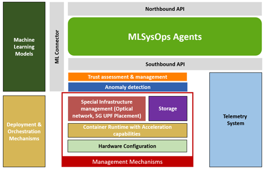 The object storage infrastructure builds upon and extends SkyFlok, a secure and distributed storage system. In MLSysOps, this infrastructure supports adaptive reconfiguration of bucket policies based on real-time telemetry and application usage patterns. The storage system exposes telemetry data regarding latency, bandwidth, and access frequency, enabling agents and ML models to optimize redundancy and placement decisions without disrupting ongoing operations. The framework also includes specialized subsystems for anomaly detection and trust assessment. These modules analyze telemetry data to identify attacks or malfunctions and classify anomalies using ML models. Their outputs are exposed through the telemetry interface and used by higher-level agents to trigger remediation strategies or adapt orchestration plans. Trust levels for nodes are computed using a combination of identity, behaviour, and capability metrics, forming a reputation-based model that influences agent decision-making.