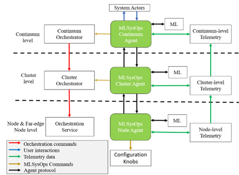 MLSysOps introduces a hierarchical agent-based architecture composed of three levels: - Node Agents reside on individual nodes and expose configuration interfaces, monitor resource usage, and provide direct access to telemetry. - Cluster Agents coordinate groups of nodes, aggregate telemetry, and issue deployment decisions or adaptation instructions. - The Continuum Agent sits at the top level, interfacing with external stakeholders (via northbound APIs), receiving high-level intents and application descriptors, and coordinating decision-making across slices. Each layer operates a Monitor–Analyze–Plan–Execute (MAPE) control loop, enabling autonomous adaptation based on local and global telemetry, system optimization targets, and ML-driven policies. Importantly, this architecture separates management logic from resource control, allowing for modular evolution and system introspection.